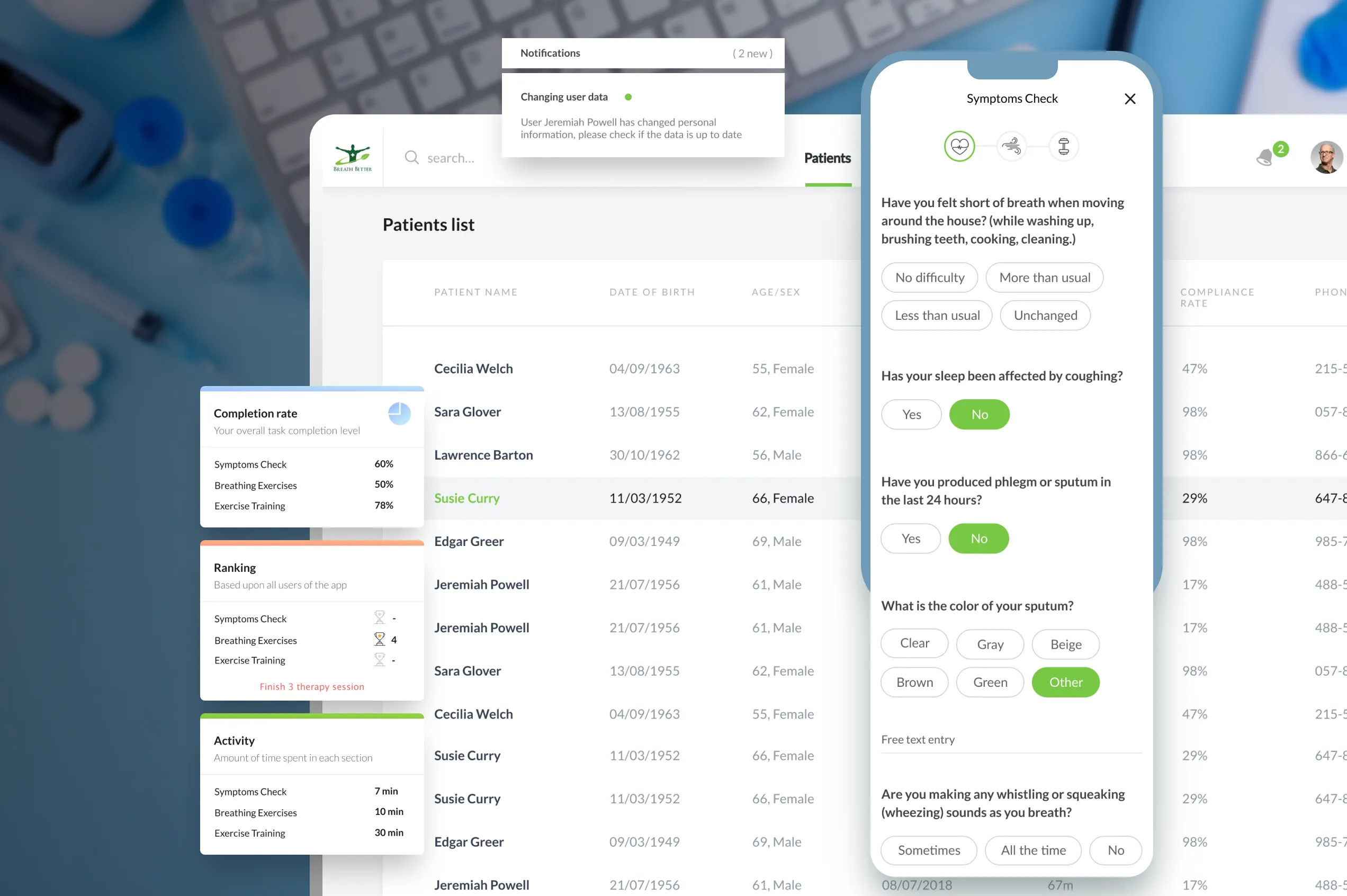 Breathe Better is a health monitoring app designed for elderly patients suffering from chronic obstructive pulmonary disease (COPD). The application simplifies the tracking of symptoms, encourages regular breathing exercises, and gives doctors access to their patients’ health data in real time.