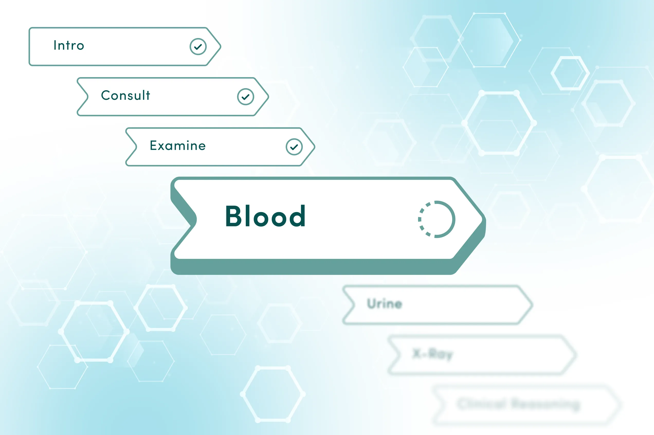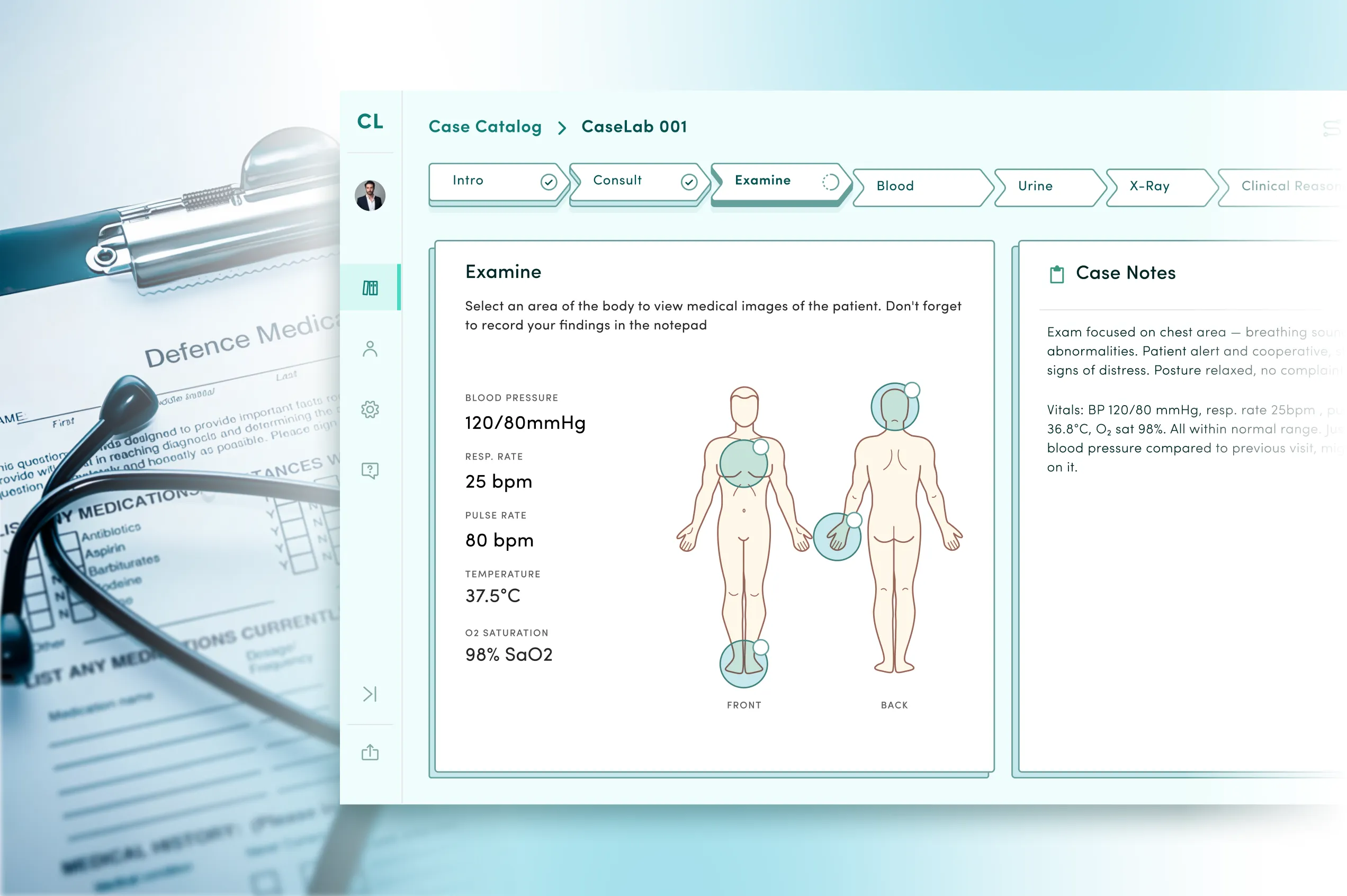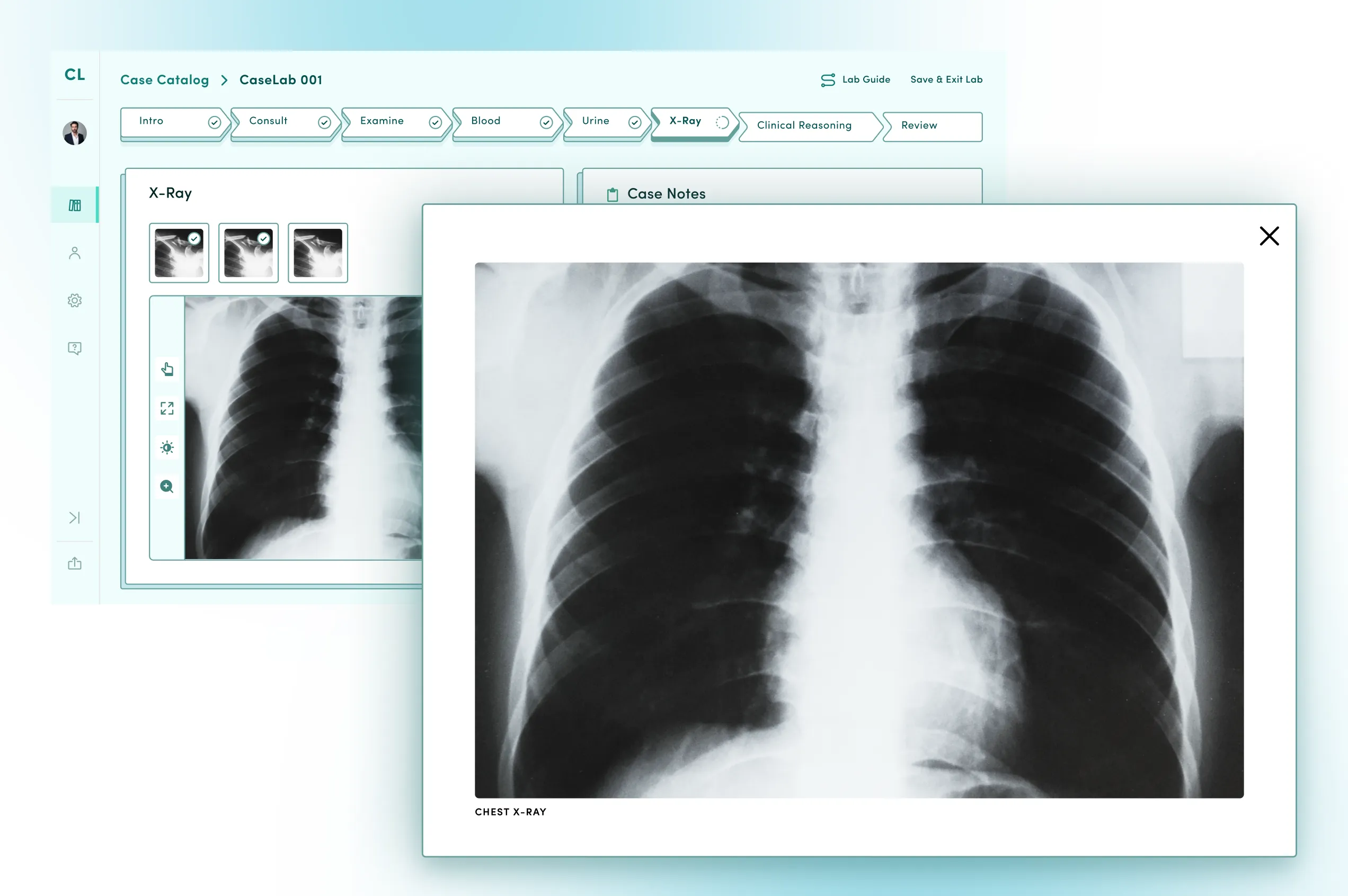 - Examine, Blood, Urine, & X-Ray: To gather more information about the clinic case, students can review medical data, such as blood and urine test results, physical examination findings, and interactive X-ray images with a zoom function.