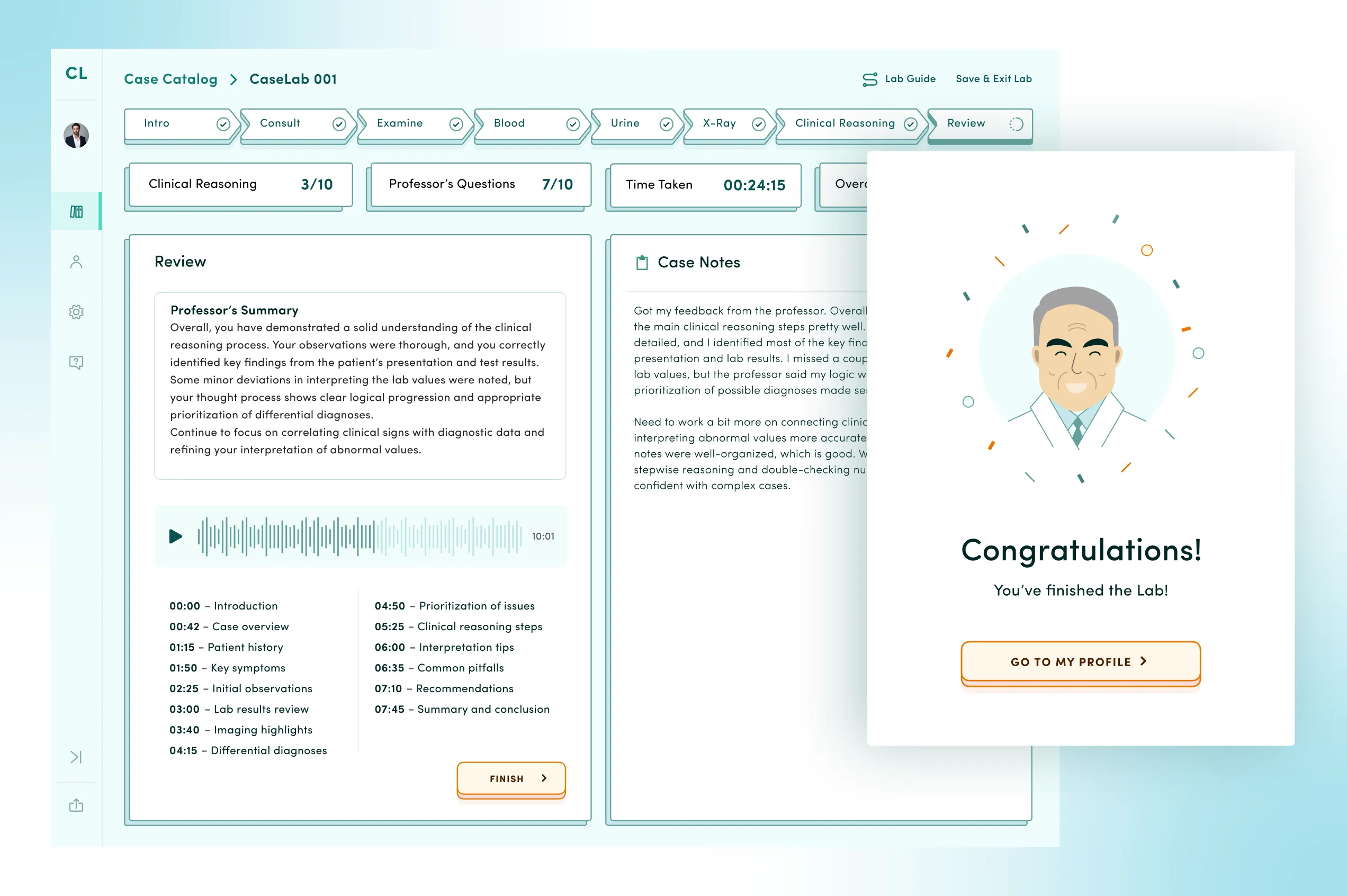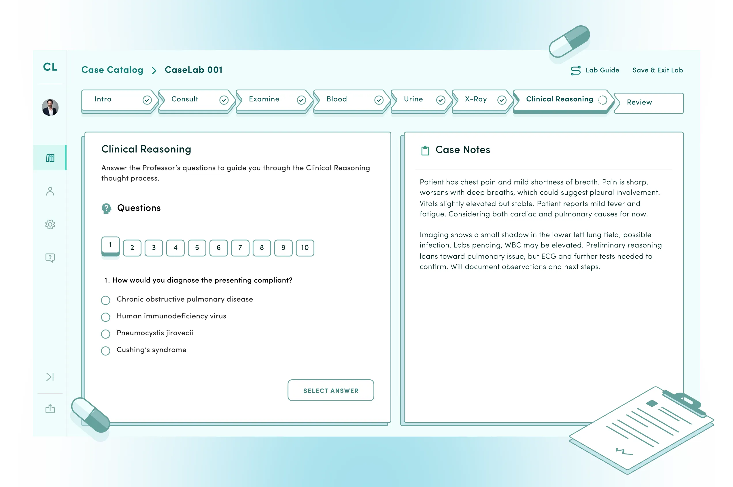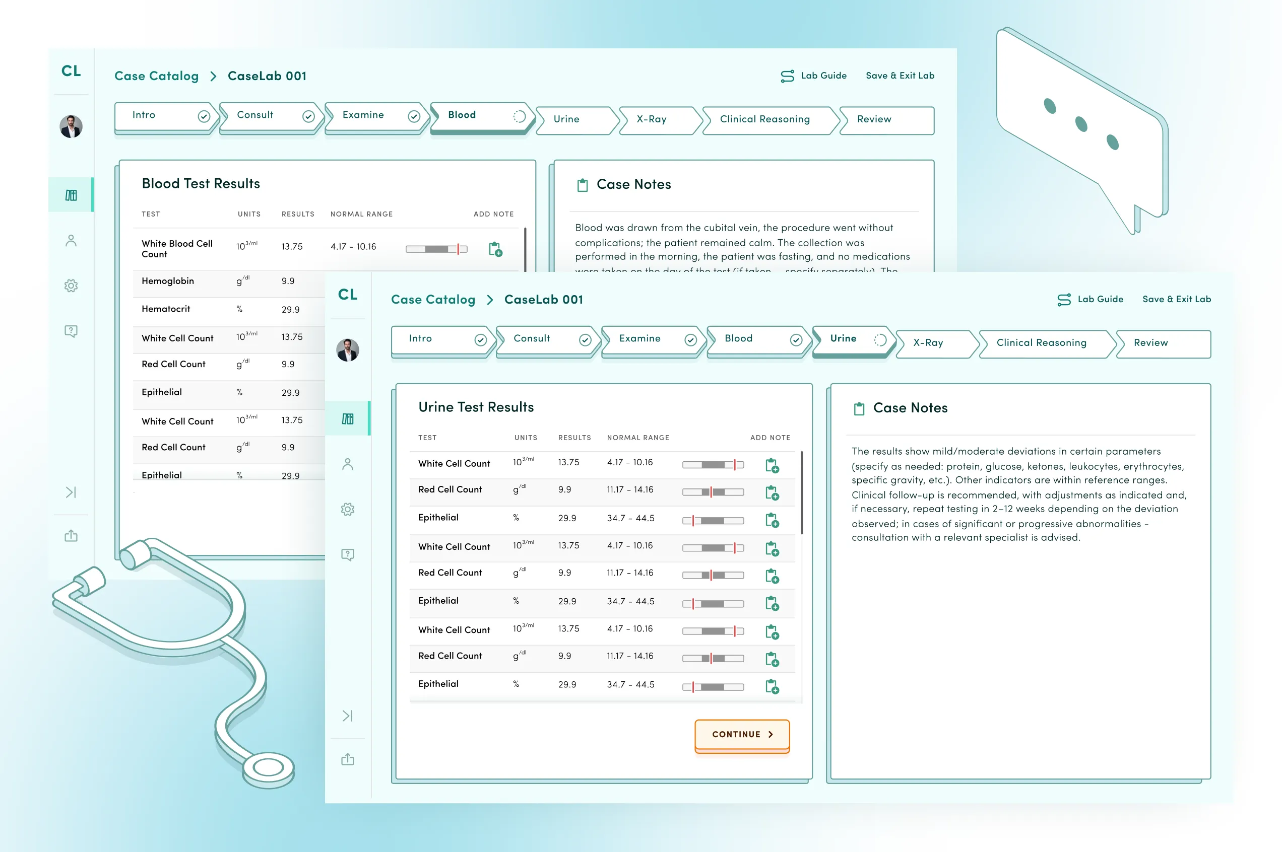 Across the case, learners can utilize the embedded note-taking function to log their findings and logic, much like they would in an actual medical environment.
