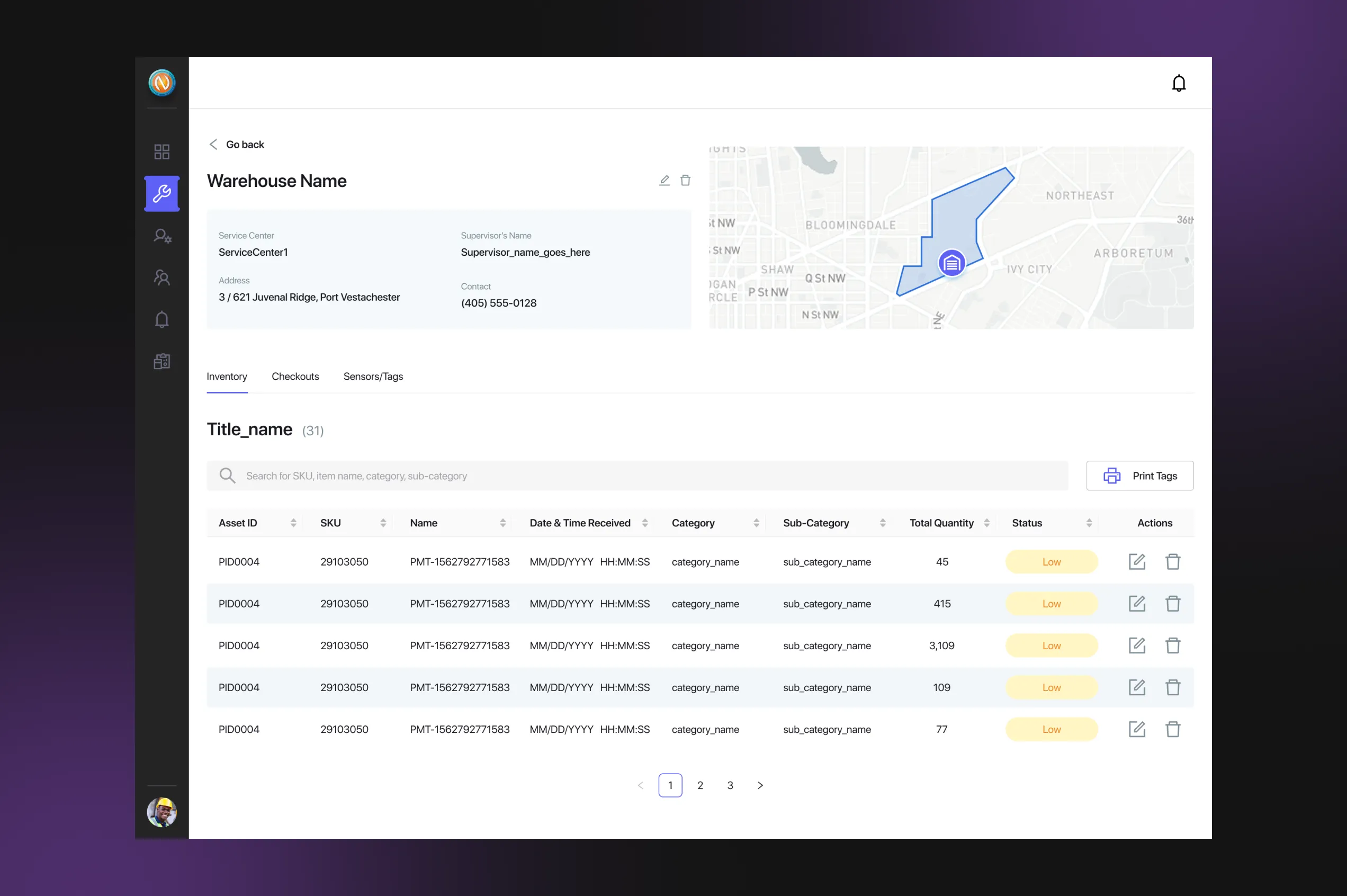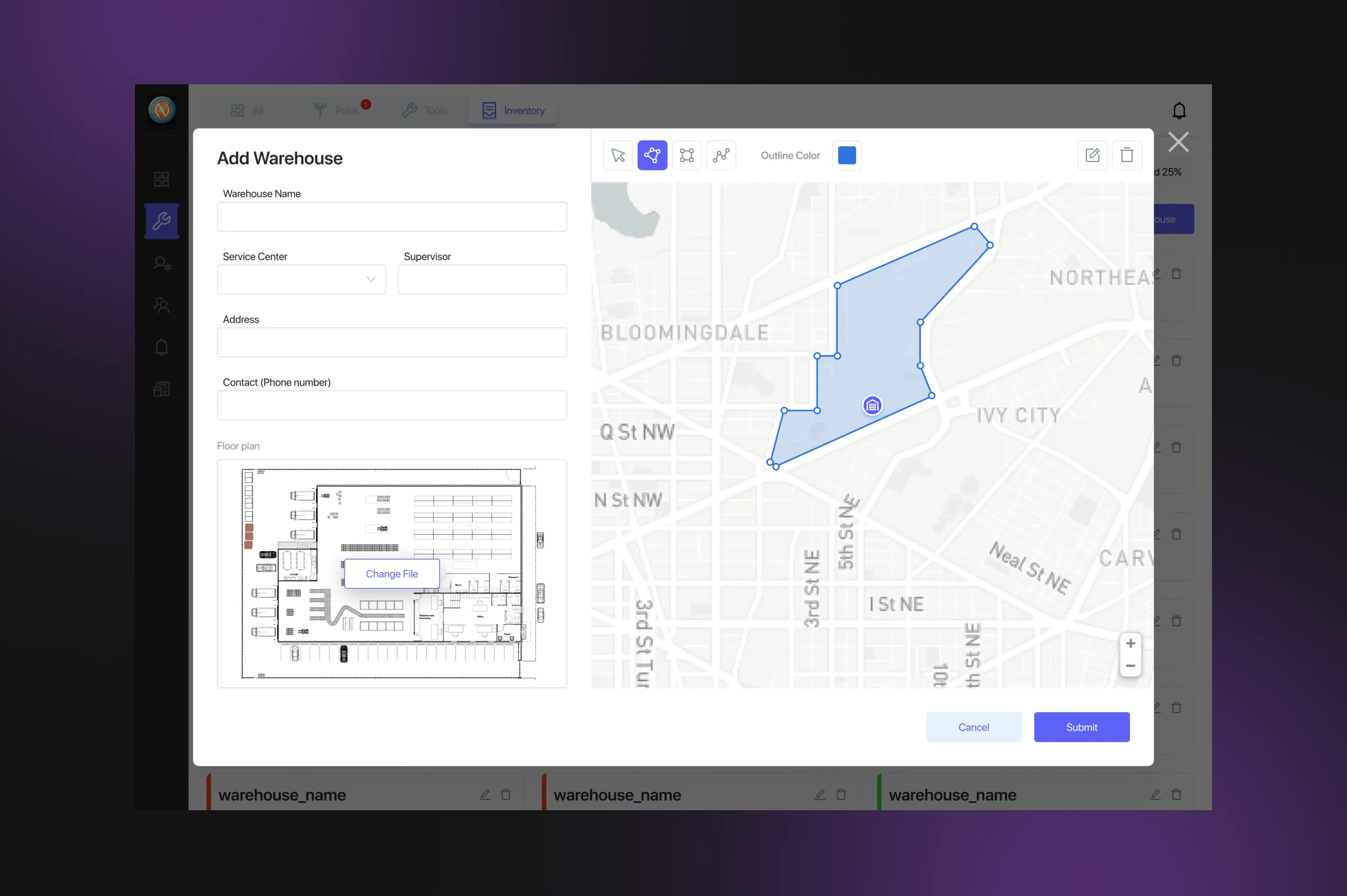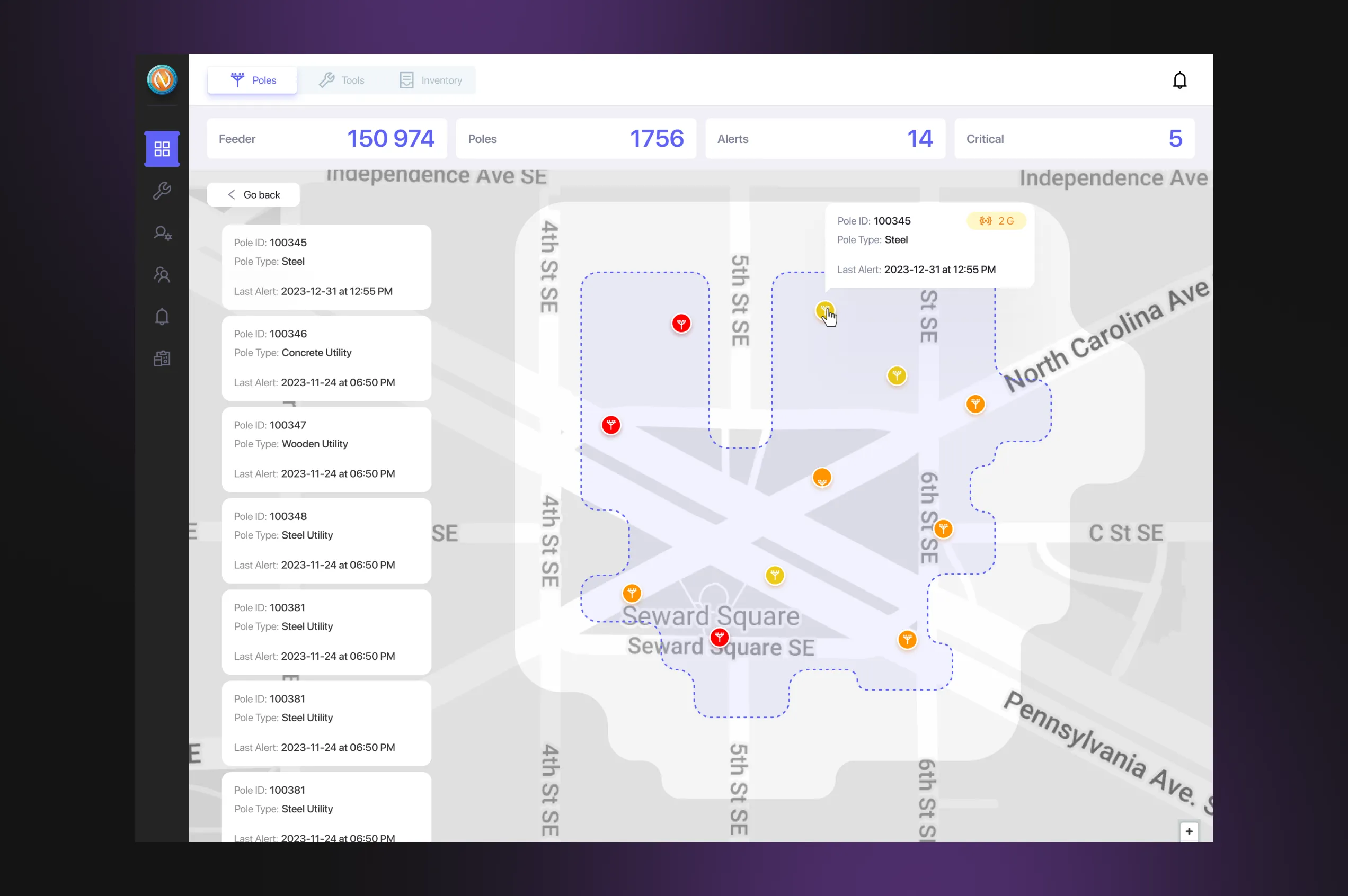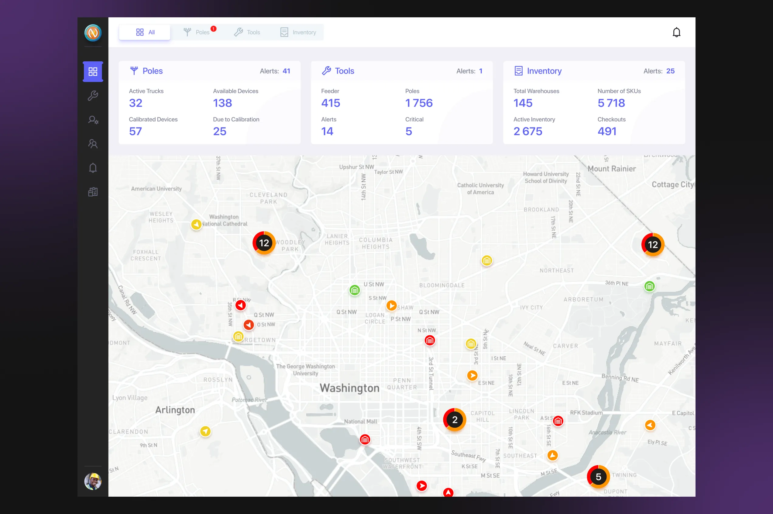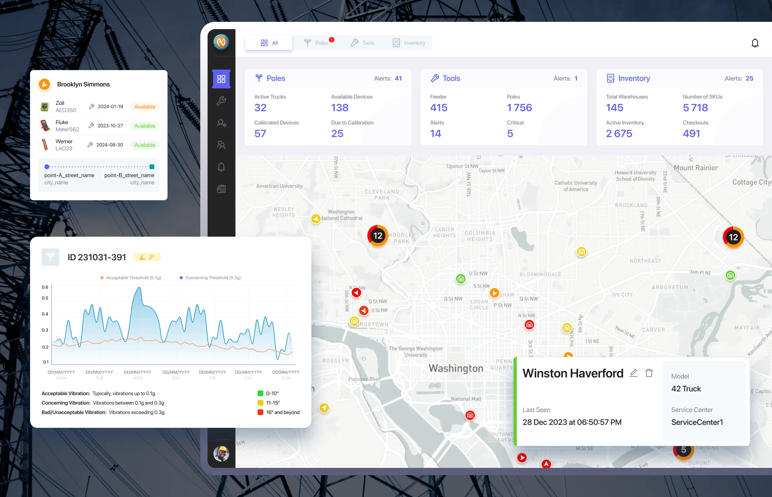 - Interactive maps that show the location of utility poles, service trucks, tools, and warehouses.