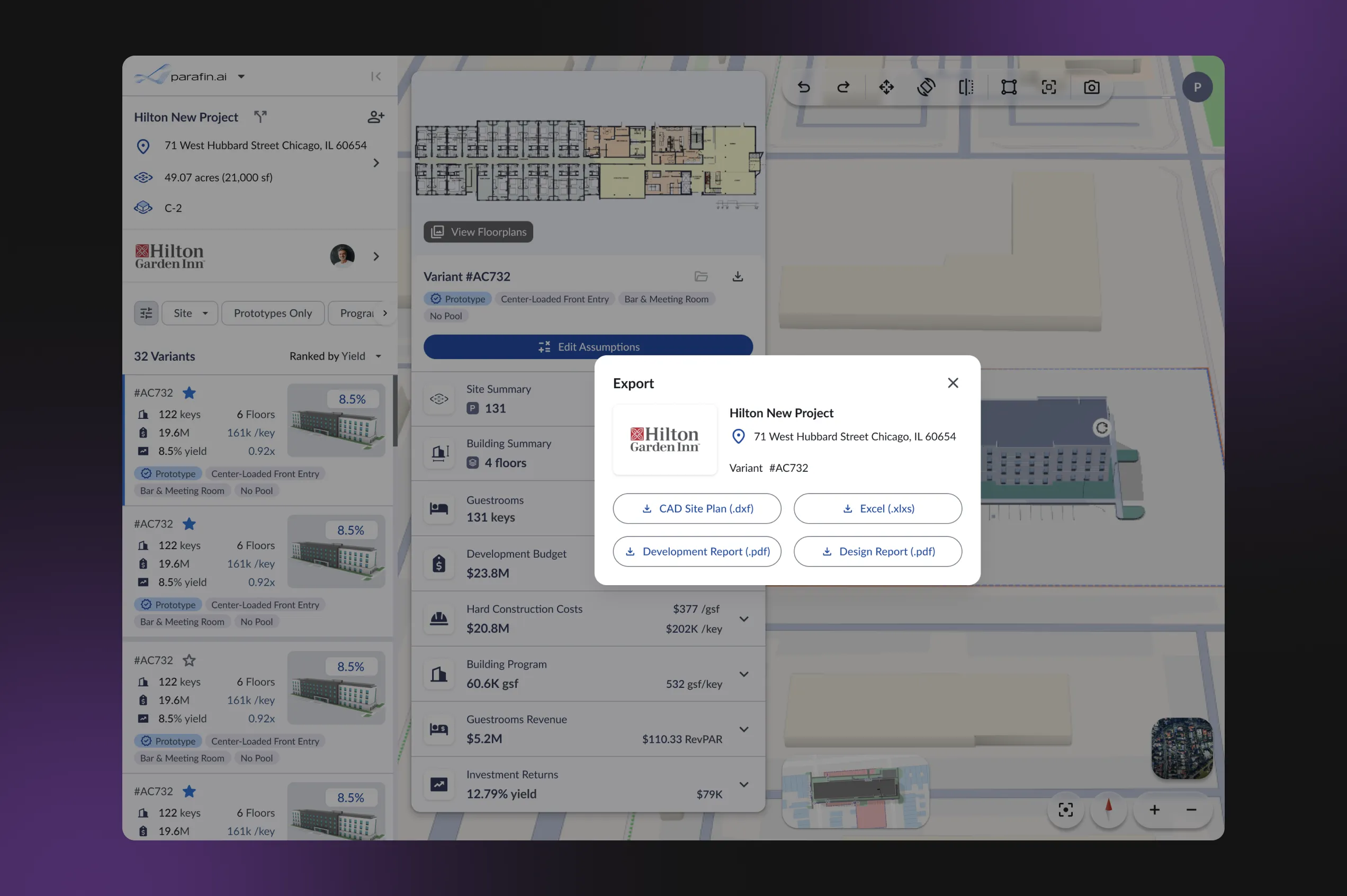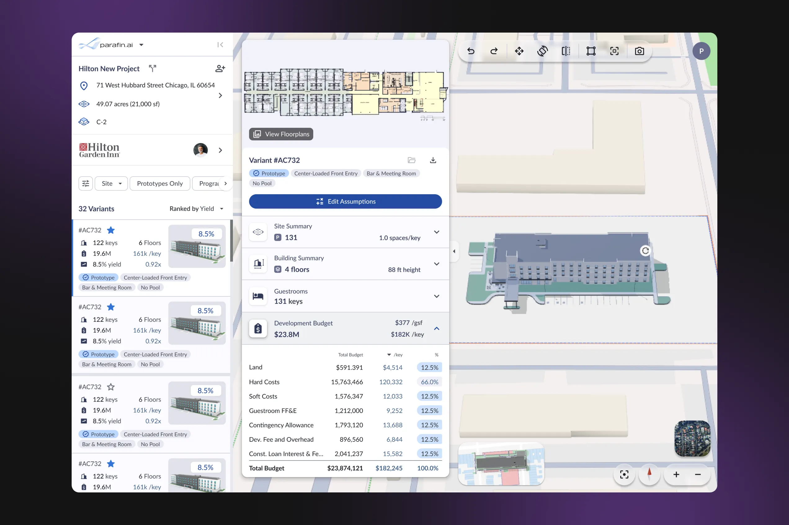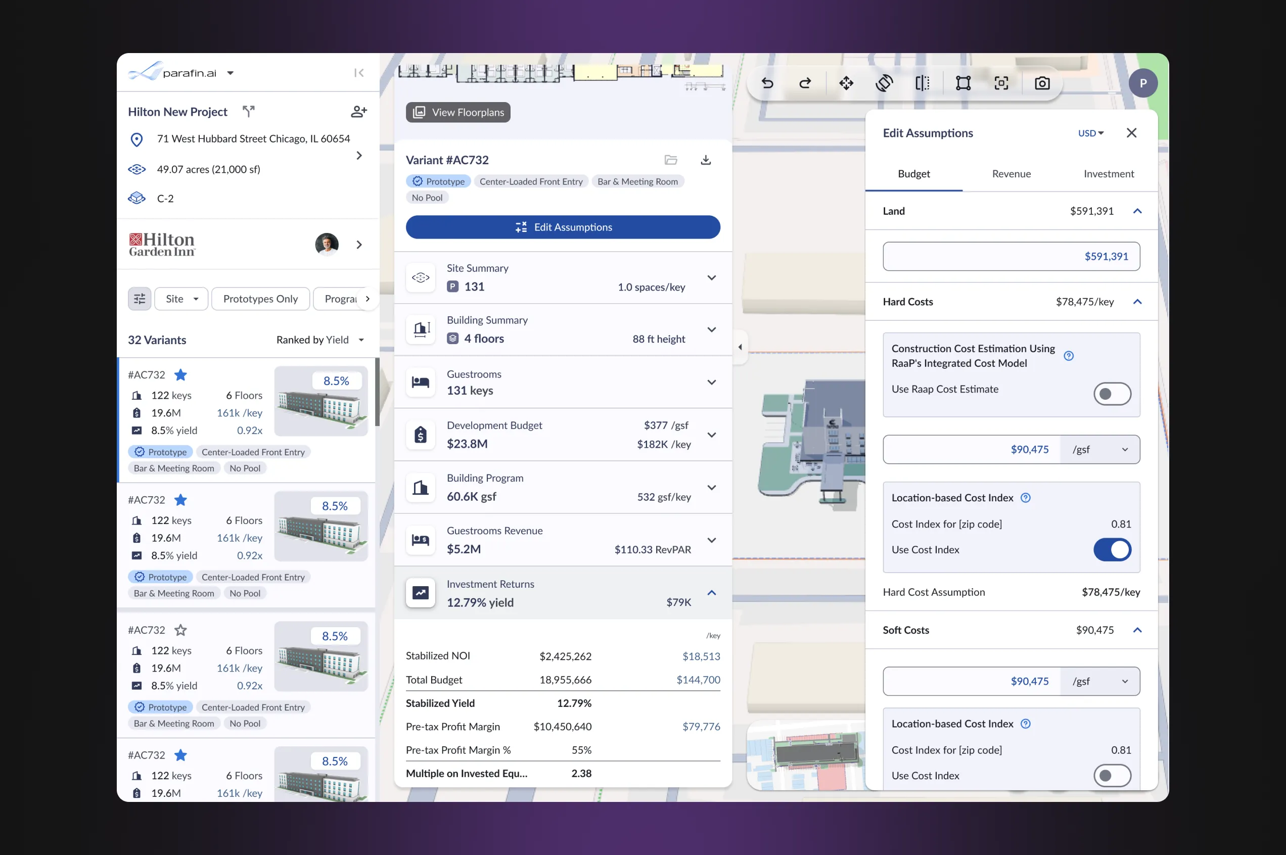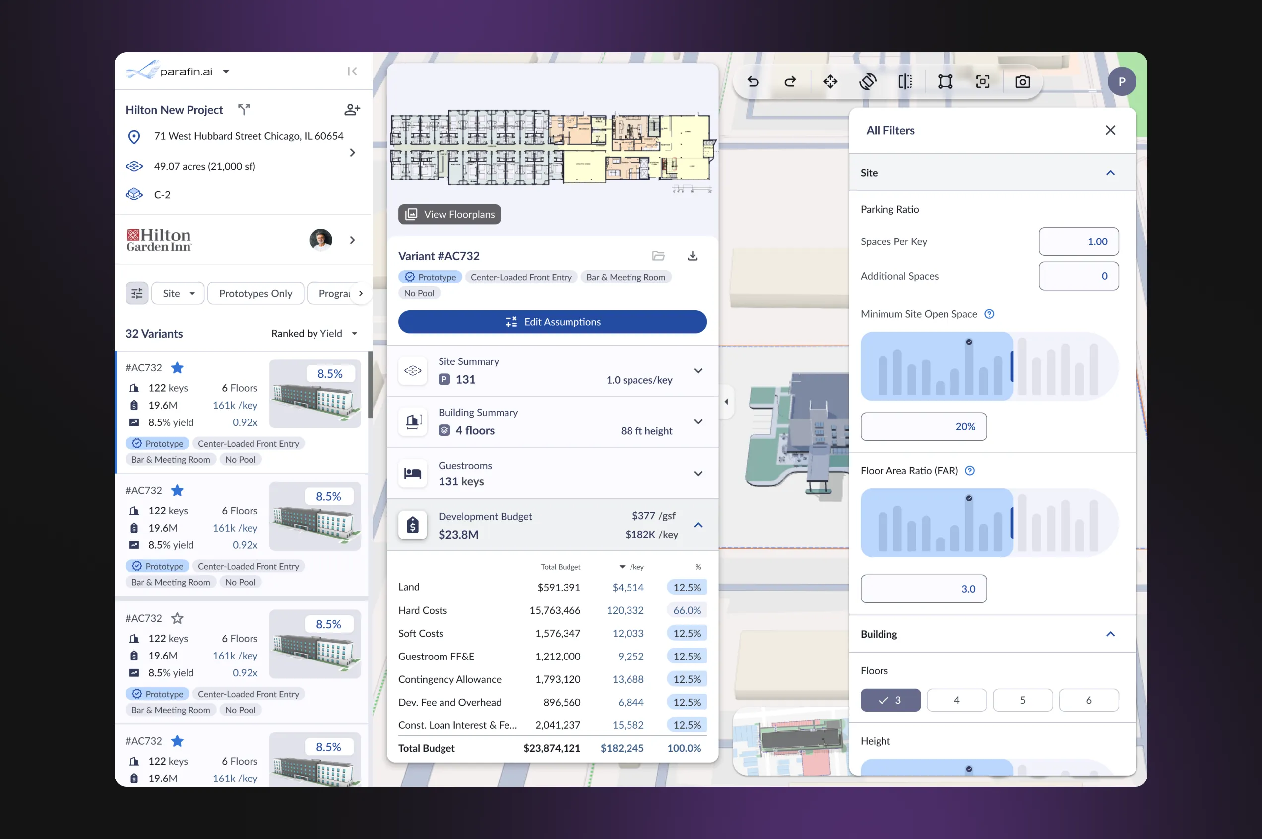 - View hotel plans in dynamic 3D on the map — understand the designs with the help of geospatial tools, compare multiple layouts, and also evaluate how the building integrates with its surroundings