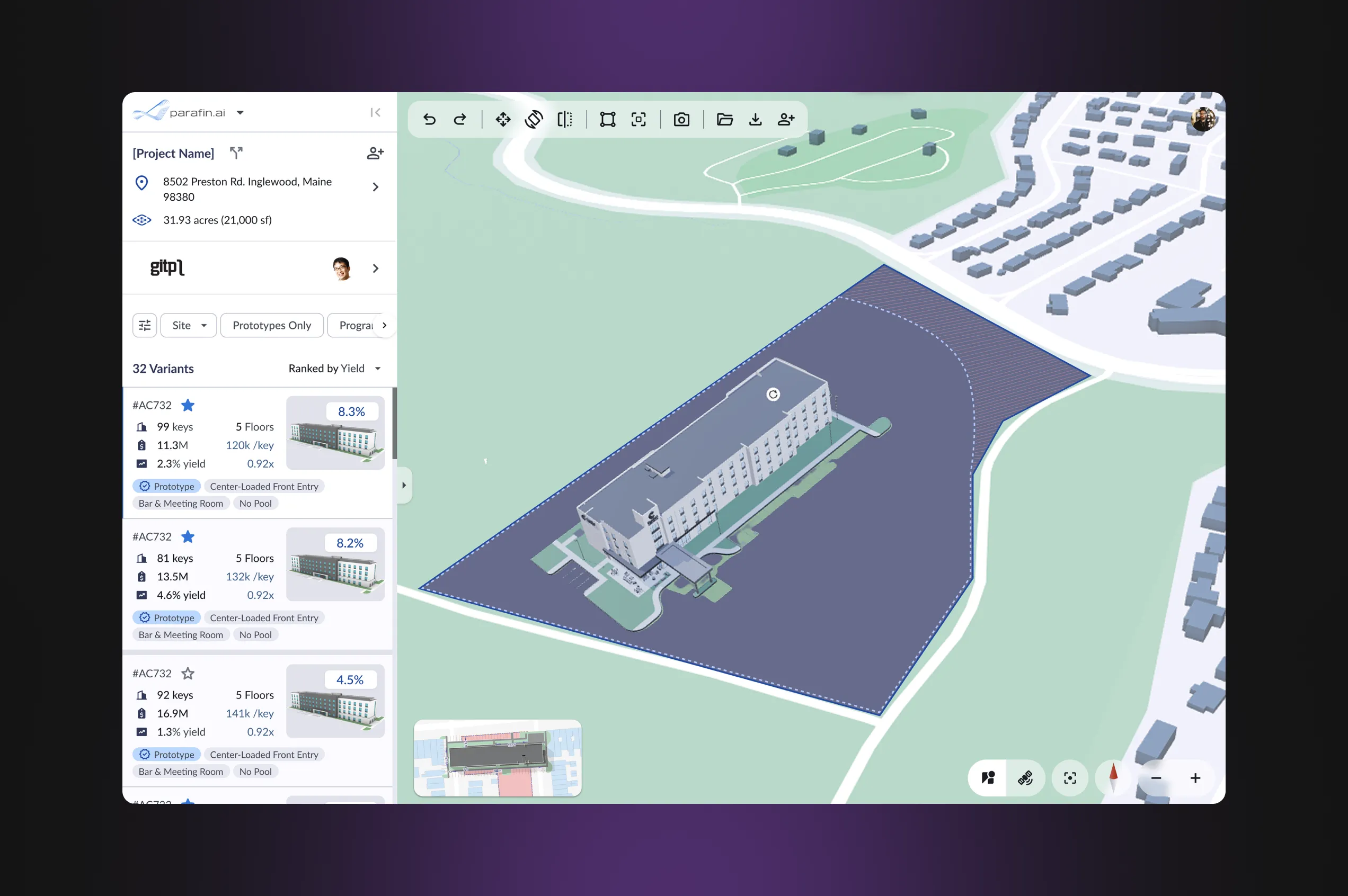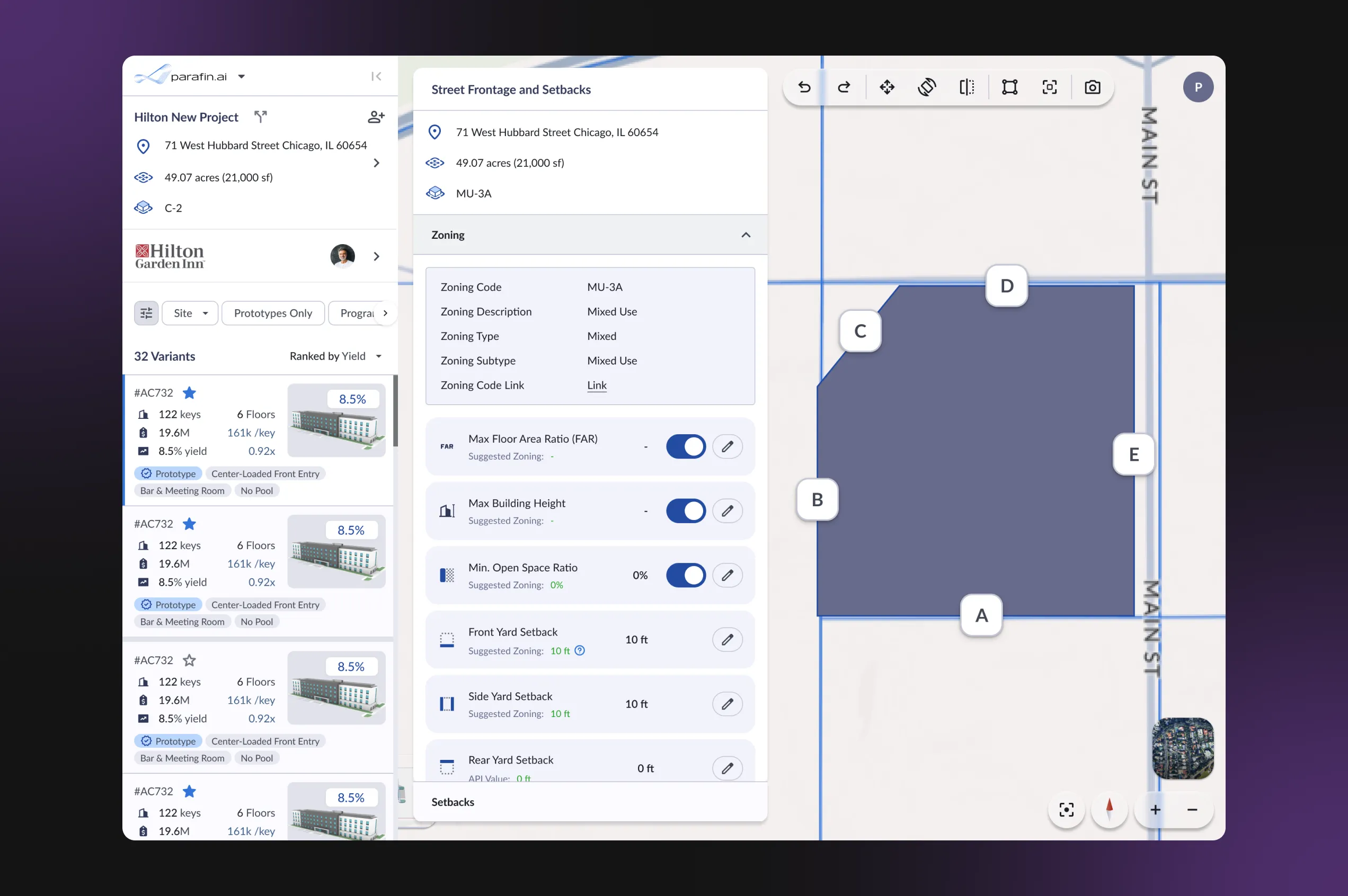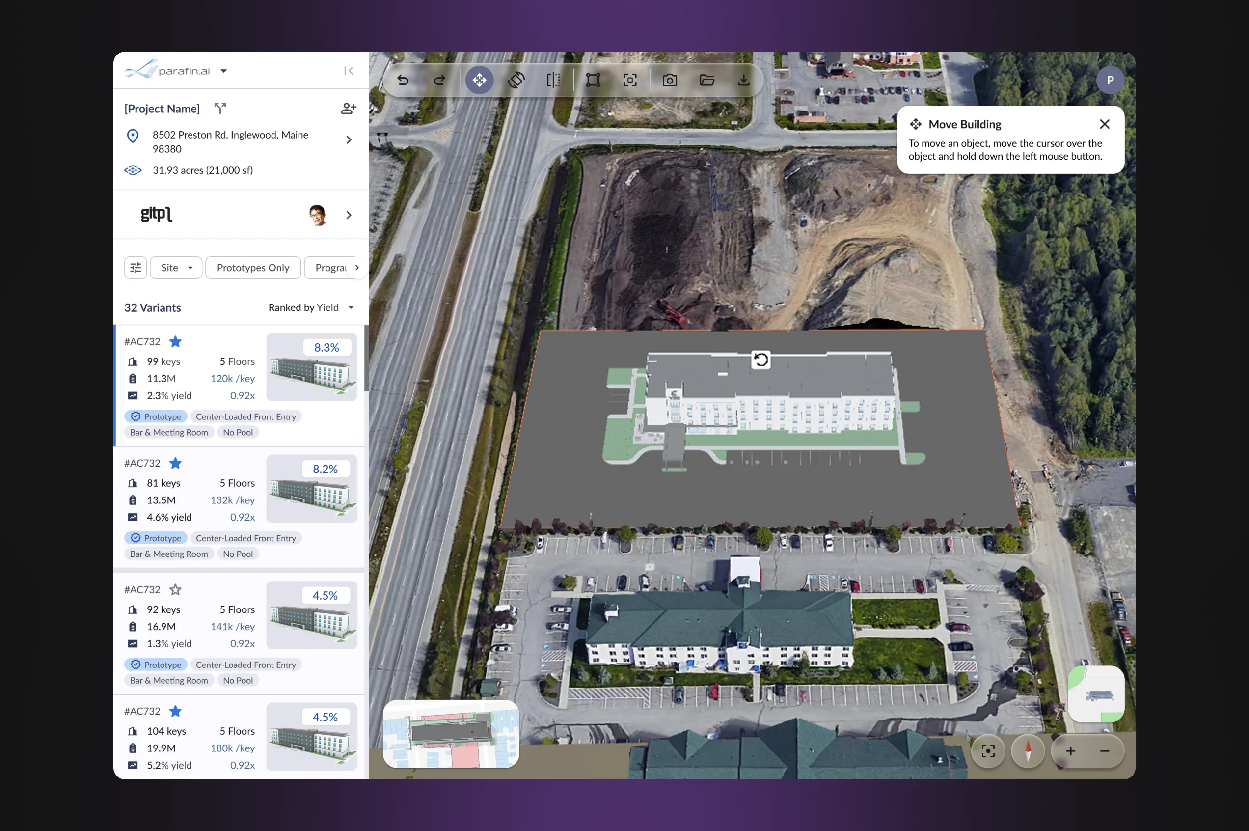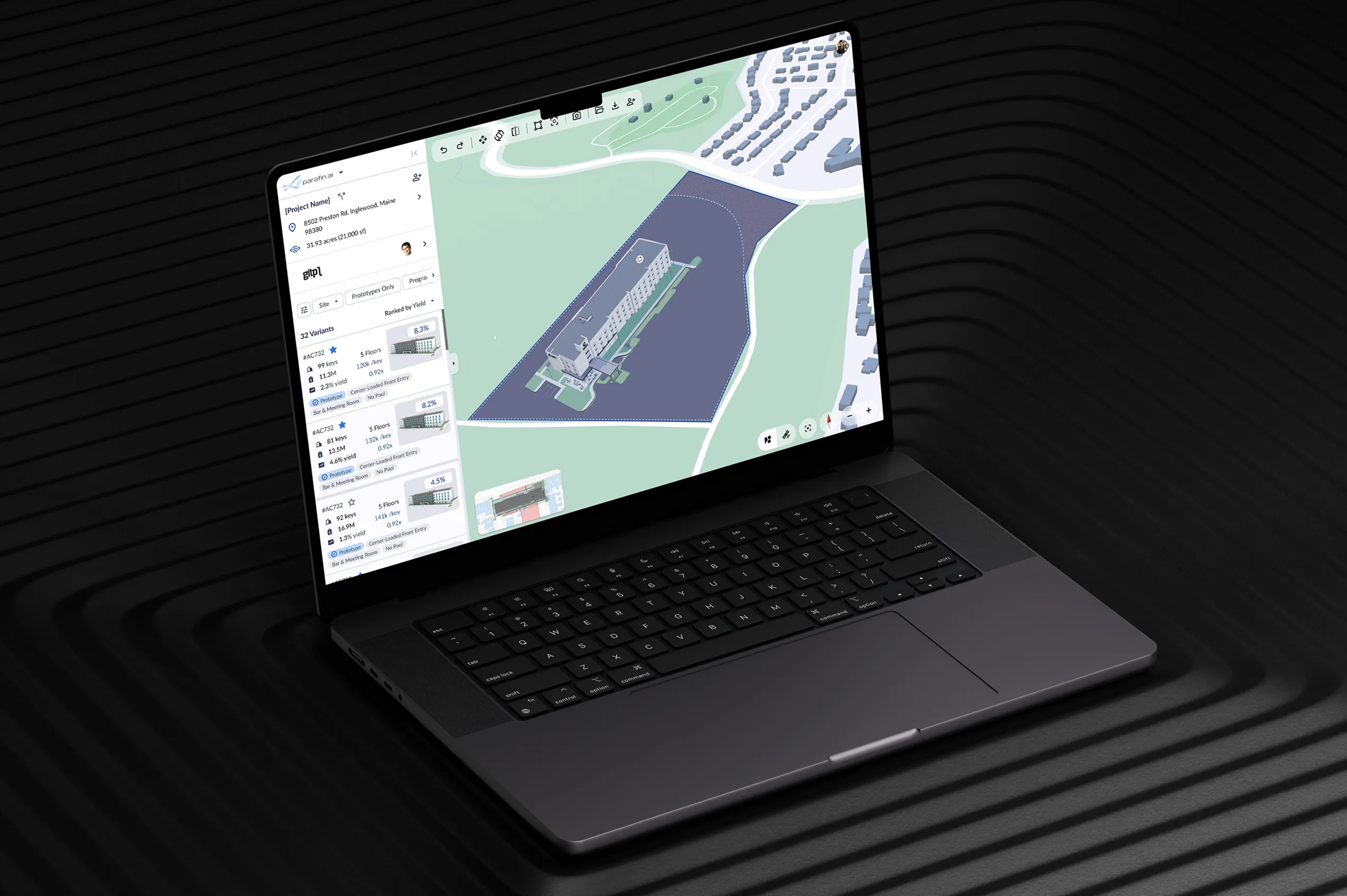 - View hotel plans in dynamic 3D on the map — understand the designs with the help of geospatial tools, compare multiple layouts, and also evaluate how the building integrates with its surroundings