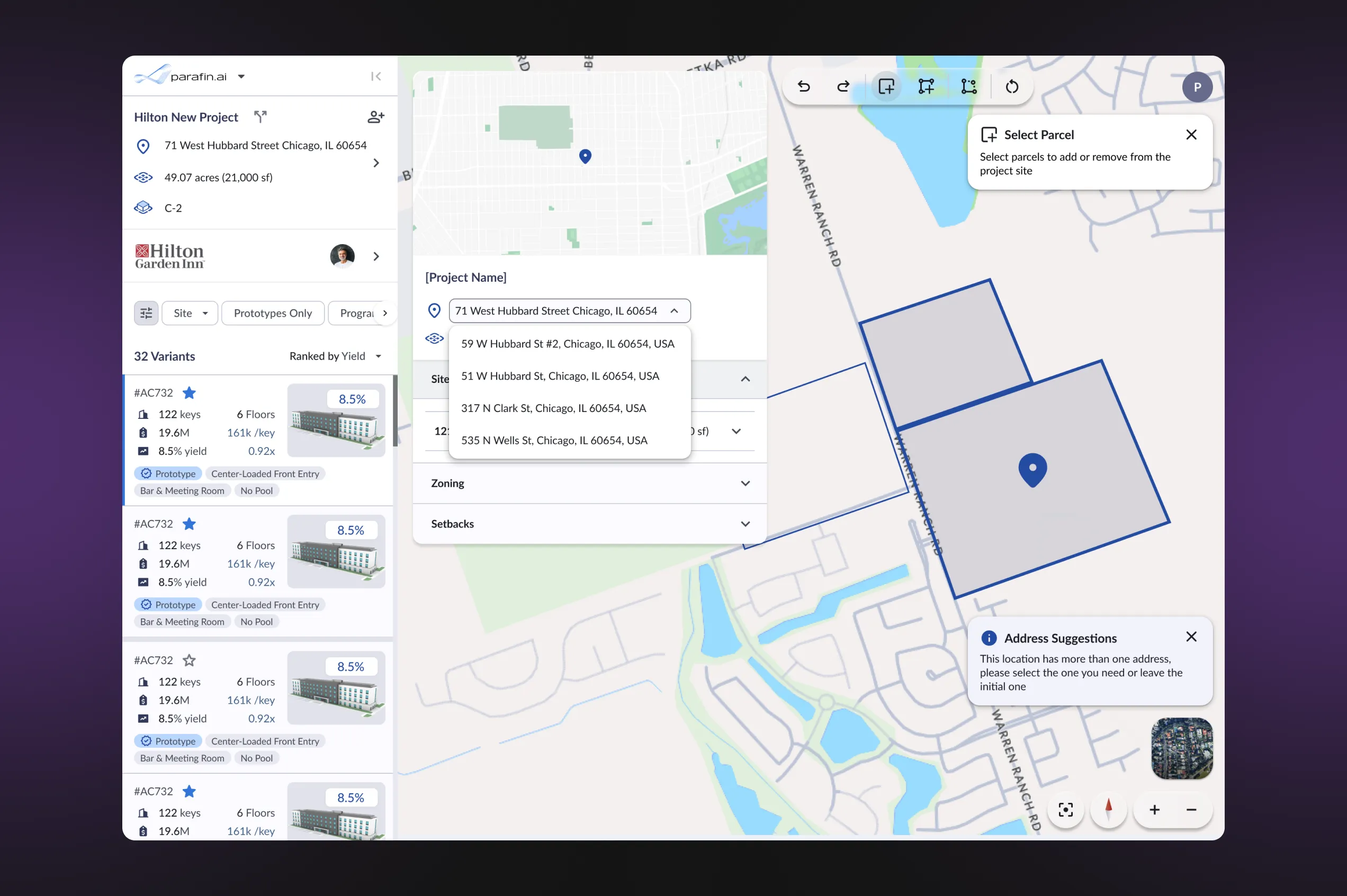 The real estate development software features a dynamic map view that shows the projected hotel at its real-world location. This tool enables users to model development scenarios, adjusting for changes in budget, location, and returns. Different brands and setups of hotels are taken into account for the calculations.