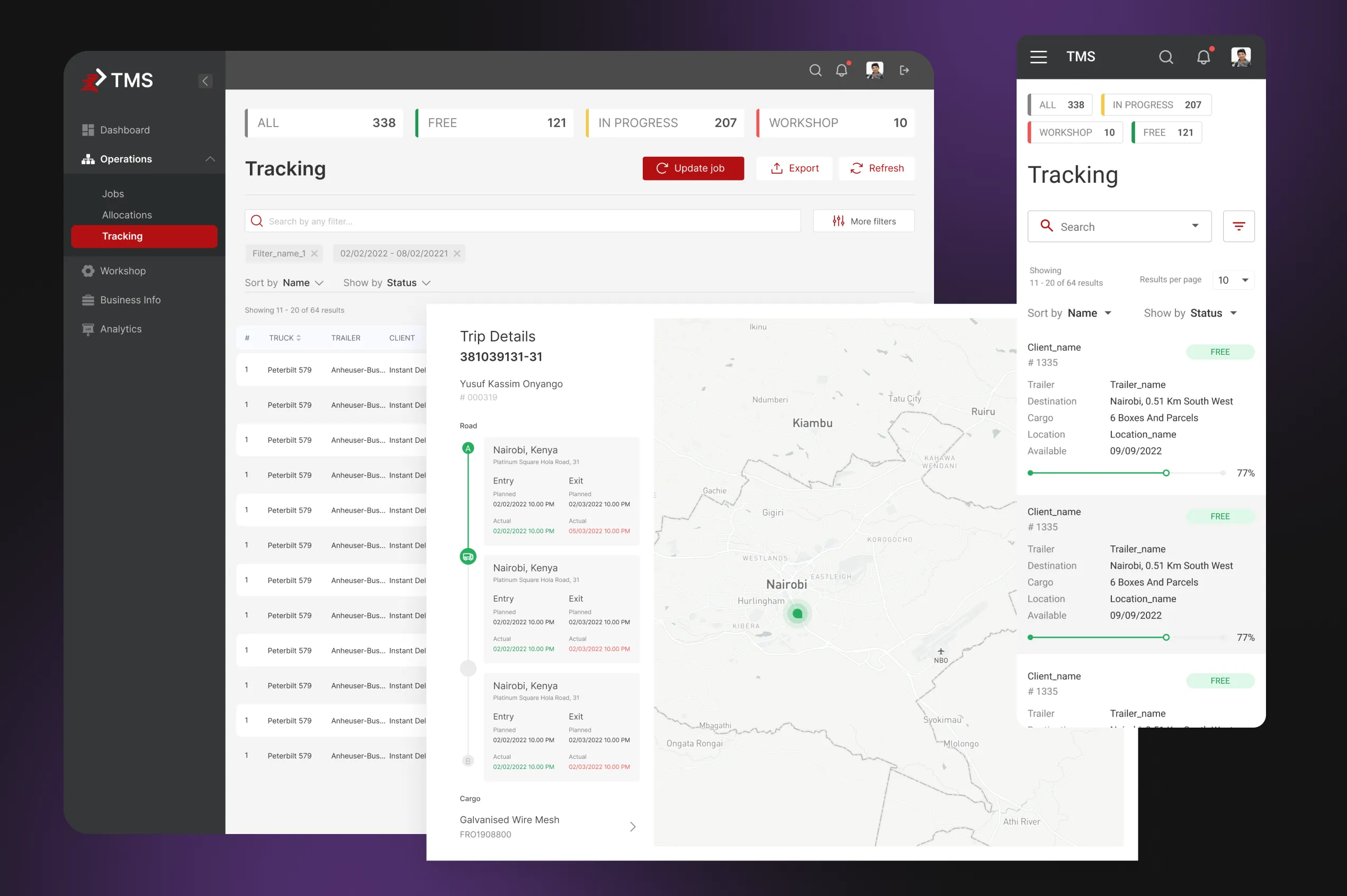 A transportation management system (TMS) was created for a transportation company in Kenya. It should allow assigning cargos to drivers, reviewing their route progress, managing cargo and trip data, allocating transportation jobs to drivers, etc. The system had to provide stable operation in the conditions of the African continent with low internet connection.